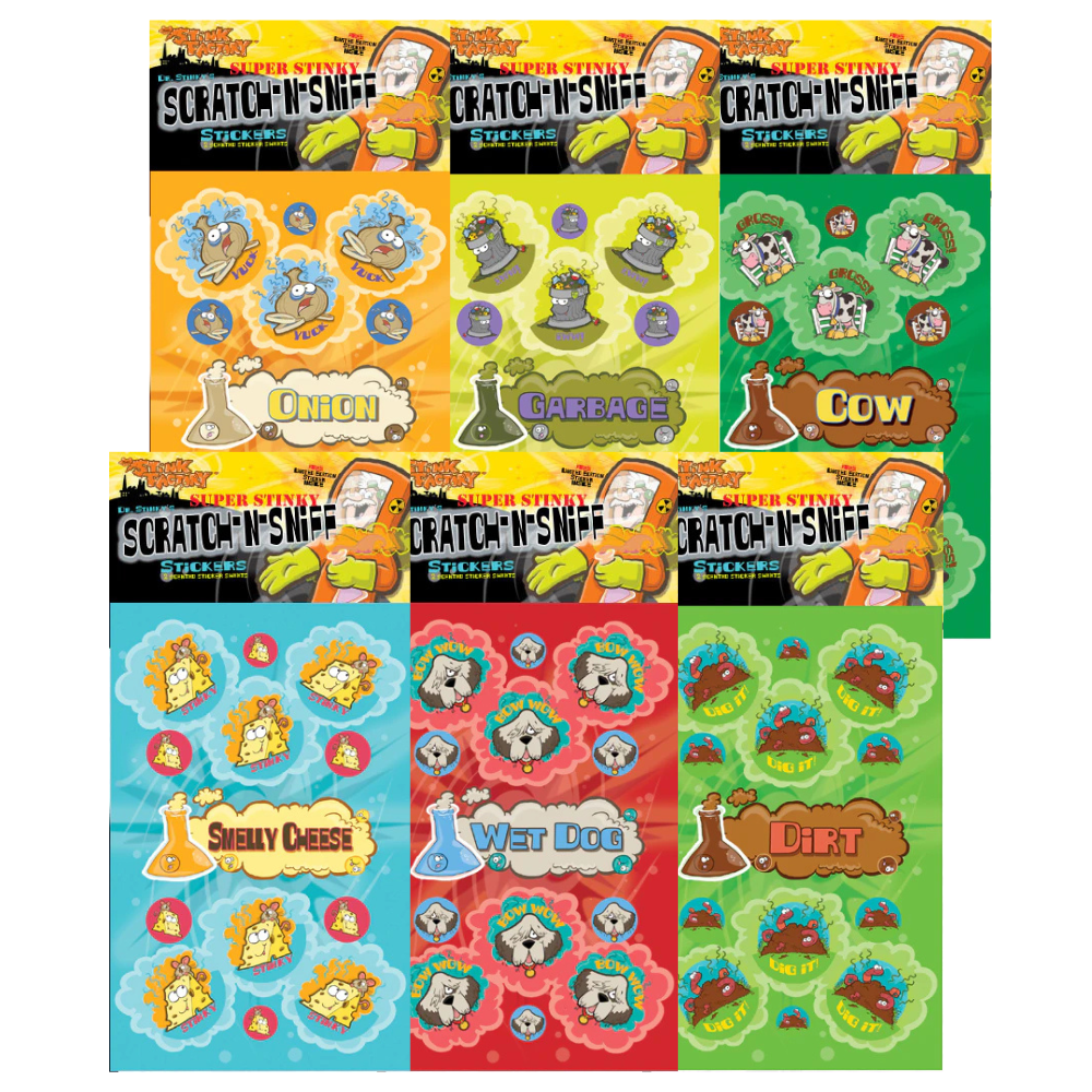 This burger meal deal packs the most insanely gross smells! This deal includes six packs of scratch and sniff stickers Dirt (Bun), Cow (Burger), Garbage (Lettuce), Stinky Cheese, Onion, and Wet Dog to help wash it all down! Each pack includes 26 scented scratch and sniff stickers, for a total of 156 scented stickers. Just lightly scratch the surface of the smelly stickers, and you will get a whiff of the smelliest burger ever!
